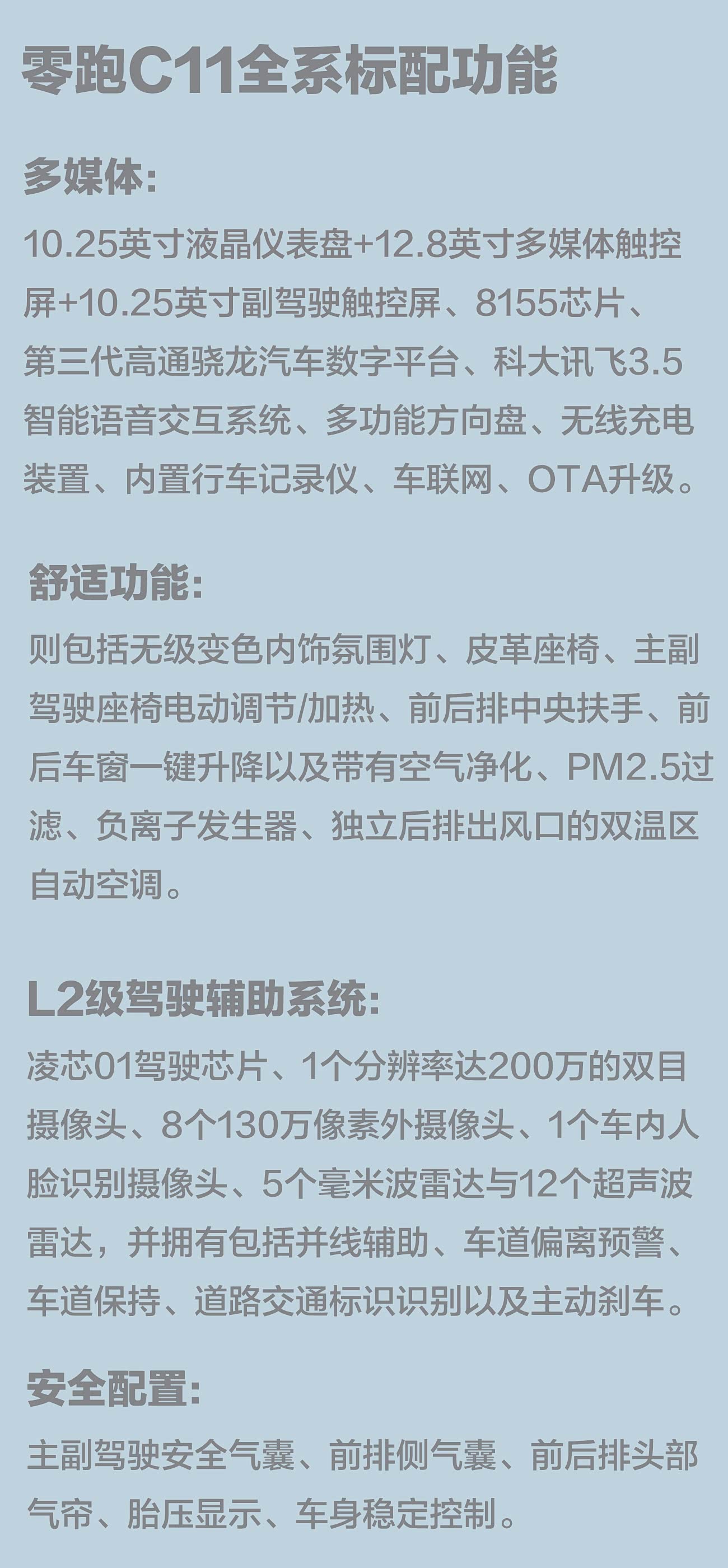 丰富的全系标配功能配置是零跑C11一大特色,新车不仅标配10.25+12.8+10.25英寸的三连屏,语音交互、在线应用、多功能方向盘、OTA升级、双温区自动空调、面部识别、L2级驾驶辅助等同样也是全系标配,绝对能够满足你的需求。