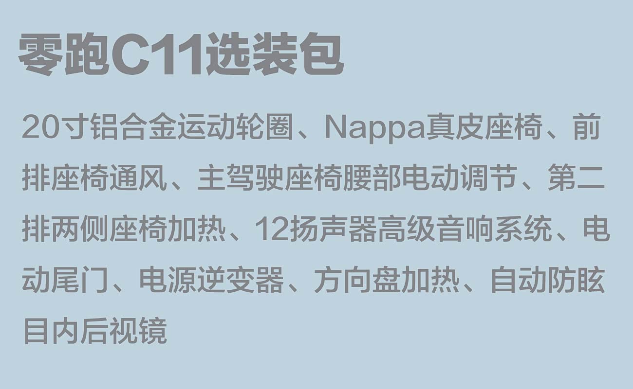 虽然零跑C11三款车型的功能已经十分丰富了,不过对于想要更多功能的消费者,零跑C11还拥有1万元的选装包可选,包括20英寸运动铝合金轮圈、Nappa真皮座椅、前排座椅通风、主驾驶座椅腰部电动调节、第二排两侧座椅加热、12扬声器高级音响系统、电动尾门、电源逆变器、方向盘加热、自动防眩目内后视镜。