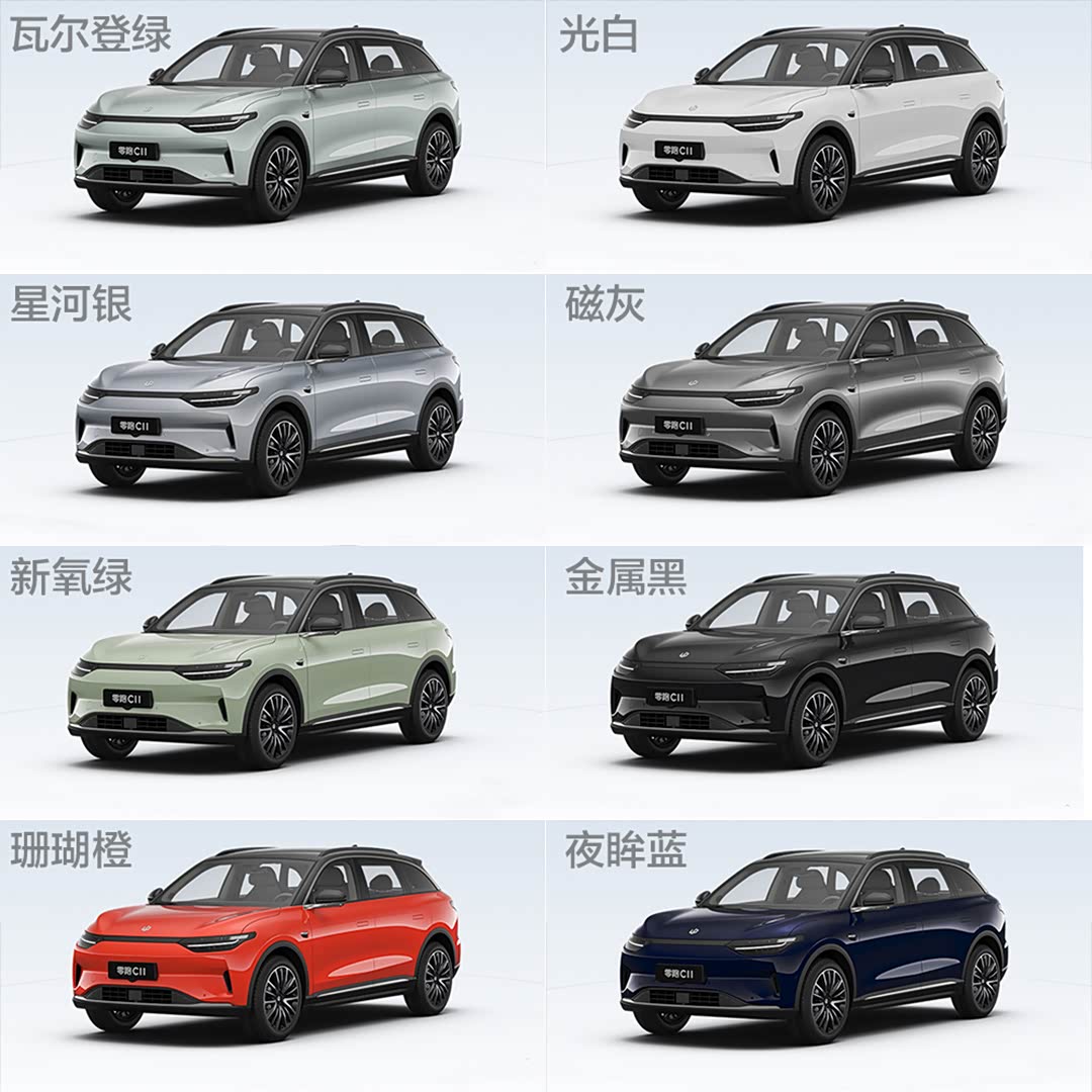 作为一款主打年轻消费市场的纯电动车,丰富的车身颜色当然也是必不可少的,零跑C11拥有8种不同风格的车漆颜色,包括瓦尔登绿(豪华版不可选)、光白、星河银、磁灰、金属黑、新氧绿、夜眸蓝以及珊瑚橙。此外,新车还提供了碳灰+岩灰、岩灰+雾紫与玄黑三种不同主题的内饰配色。总体看来,8种颜色车身与三种主题内饰组合可以非常丰富了,绝对能够满足你的个性化需求。