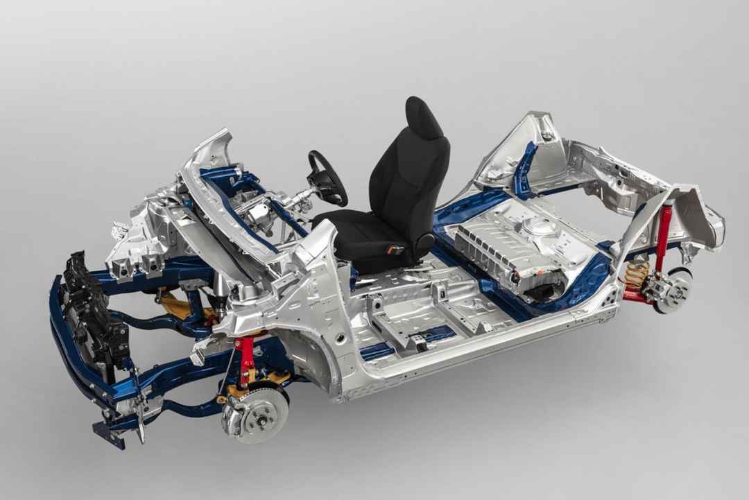 丰田对于TNGA架构GA-B平台的展具,多保留了A柱底部、防火墙、地板、后轮拱等在内的一部分车身结构,可以看到后避震器弹簧与车身的连接。这自然也不能称之为“底盘”(本来就是用来展示平台而非底盘),此状态下的车身缺失了上部,不具备完整的受力结构。