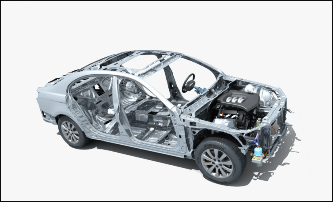 对于承载式车身结构,车身,或者说不含覆盖件的白车身包揽了一切,底盘作为一个单独部件的历史就此结束了。车辆受到的应力是由白车身基础结构承受的,即纵梁、横梁、地板、A/B/C柱、侧围、减震器塔顶、加强结构等等。