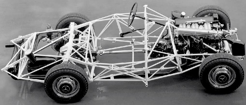 比如下面是奔驰300SL(鸥翼门鼻祖)的笼式车架底盘,理论上讲装个椅子就能正常开走了。这张图如果去掉整个动力系统,剩下的部分就是所谓底盘。