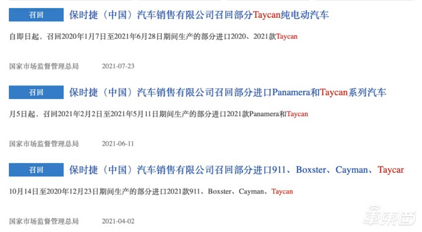 今年6月,保时捷又对Taycan车型进行了小规模召回,召回范围包括2021年2月2日至2021年5月11日期间生产的部分2021款Taycan系列车型。