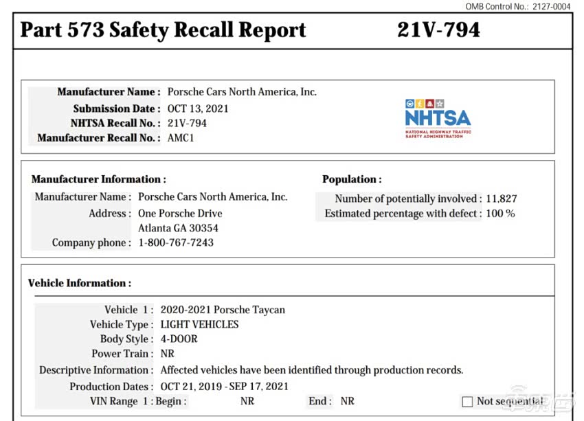 从美国国家公路交通安全管理局(以下简称NHTSA)上面发布的召回公告来看,此次召回车辆涉及生产日期在2019年10月21日至2021年9月17日的2020款和2021款保时捷Taycan车型(包括Cross Turismo猎装版),预估缺陷比例为100%。