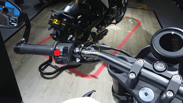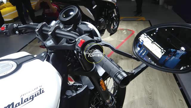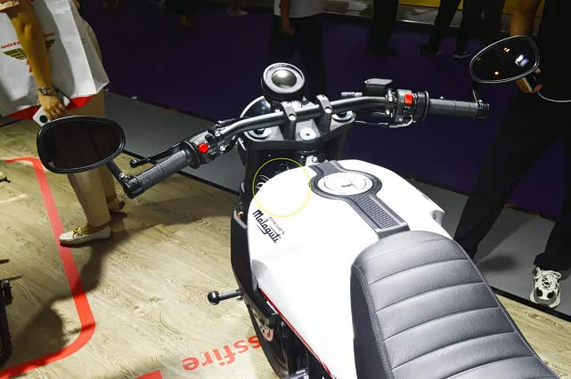 平直的手把位置较低而且比较宽,外挂的后视镜也很能凸显Cafe Race的味道,圆形液晶仪表的面积不大,因为没有点亮并不能看到里面的具体信息。