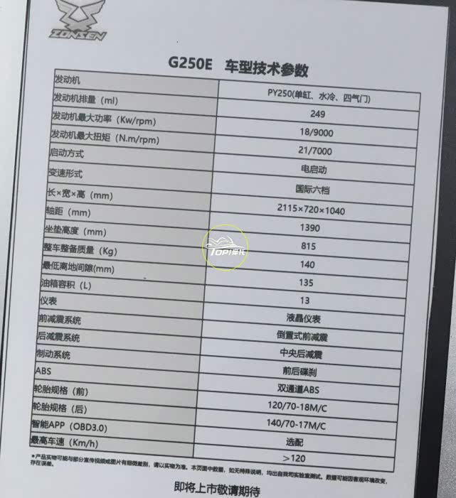 动力方面,搭载一台型号为PY250X的,249cc排量单缸水冷四气门发动机,最大功率18kw/9000rpm,最大扭矩21Nm/7000rpm。这台车的整备重量只有140kg,在单缸250当中都算是比较轻的那一拨,动力方面的表现值得期待一下。