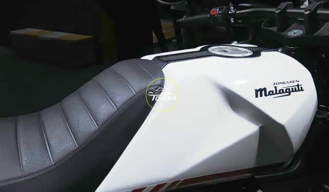 油箱的造型很带感,容量有13升,看上去确实有点像高金GK500,坐垫的设计很贴心,几乎覆盖到了油箱的上部。因为坐姿可能前倾,所以设计师最大程度地考虑到了男性用户的使用体验。