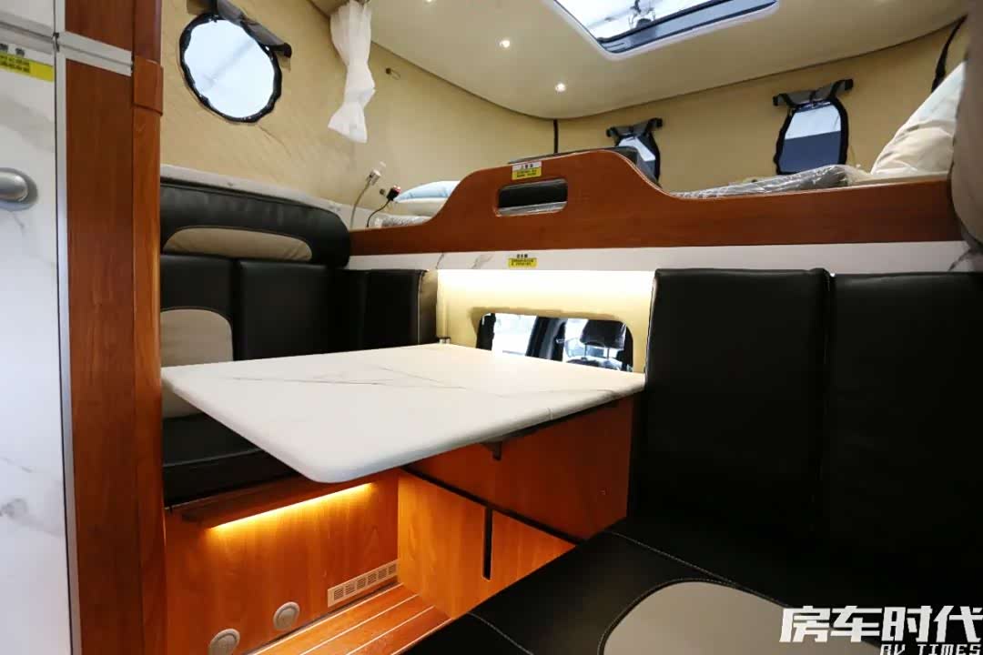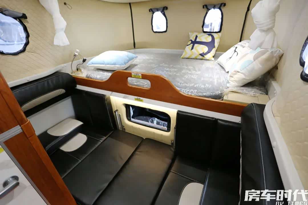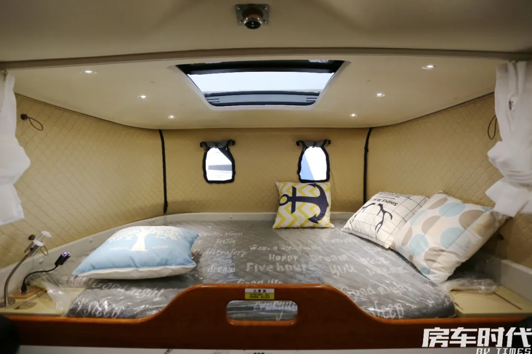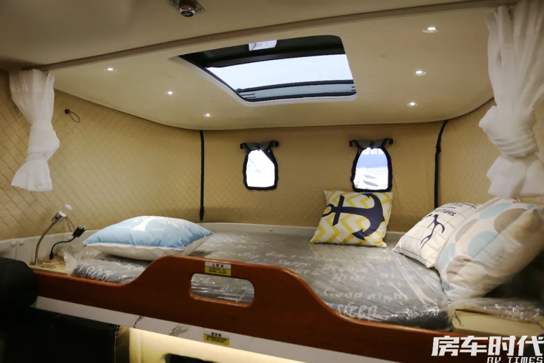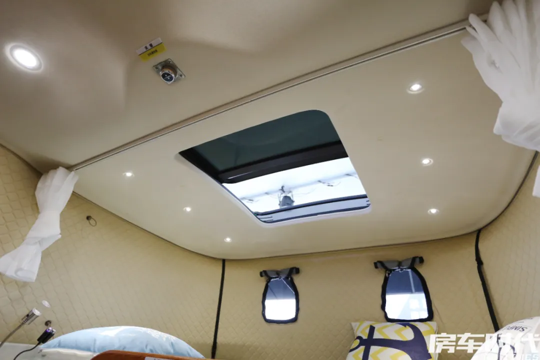 来到后车生活区部分,各种设施囊括其中,休息床铺、客厅、厨房区、卫浴间,虽说车身小巧,但这些却一个不少。升顶结构打开后,驾驶室上方的双人额头床就露了出来,尺寸1920*1260mm,床铺旁边还有阅读灯、小型储物架、充电插座等使用设施。顶部开有天窗,透过弧形天窗仰望的璀璨星河,是旅途中一个值得铭记的画面。