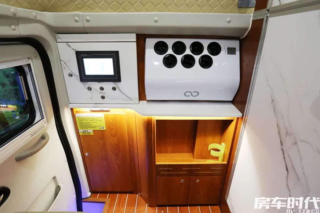 尾部左侧为车内电路控制系统,车型采用24V弱电系统,用电更安全,配备24V 240Ah锂电池和300W的双层柔性单晶太阳能电池板,用以满足日常使用需求。