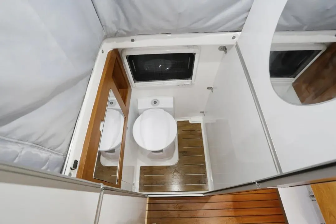 尾部的卫生间采用折叠式的设计,随着车辆的升顶,自身带有一个向上的拓展结构,保证私密性。卫生间内部,配备有进口盒式马桶、折叠式洗手池、抽拉式淋浴花洒、梳妆镜、换气扇、储物柜等设施。