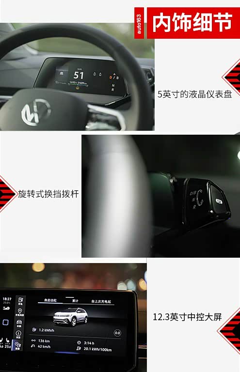 5英寸的液晶仪表盘再加上这块几乎可以操作车内所有功能的12.3英寸中控大屏,让车内科技感油然而生。位于方向盘2点位置后方的旋转式换挡拨杆,也是属于大众ID家族标志性的设计。