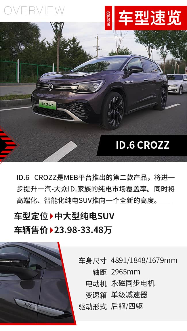 ID.6 CROZZ同ID.4一样,都是基于MEB纯电平台打造,使得它拥有了极为纯粹的“新能源血统”。背靠大众百年造车的历史,又让它能给你堪比传统德系燃油车的驾驶感受与安全的品质。