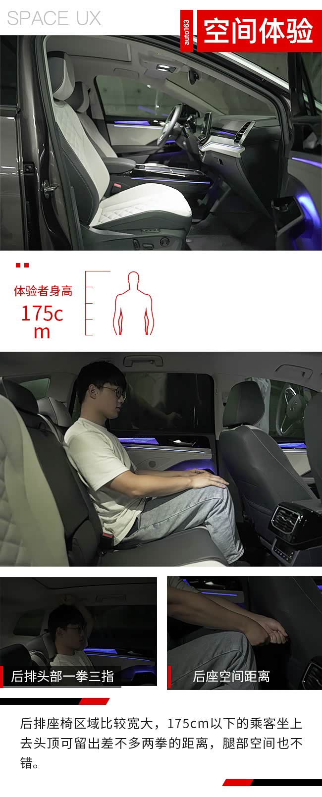 空间方面,依托于2965mm的超长轴距,身高175cm的体验者调整好坐姿后,在前两排都能获得比较充裕的乘坐体验,乘坐感舒适。