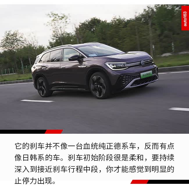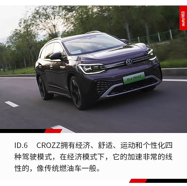 ID.6 CROZZ的驾驶感受完全不同于其他新能源电动车。ID.6 CROZZ拥有经济、舒适、运动和个性化四种驾驶模式,其中个性化模式下可对动力、底盘、方向盘、空调等功能做出调整。在经济模式下,它的加速非常的线性的,像传统燃油车一般。而不是像其他电动车车那样,一踩电门,就会有非常猛烈的推背感。当然,它驾驶中动力感受依旧比传统燃油车会更足,毕竟也是一台血统纯正的电动车。而在运动模式下,则起步会更加狂暴,在高速情况下,松开电门后也会有种轻微的拖拽感。