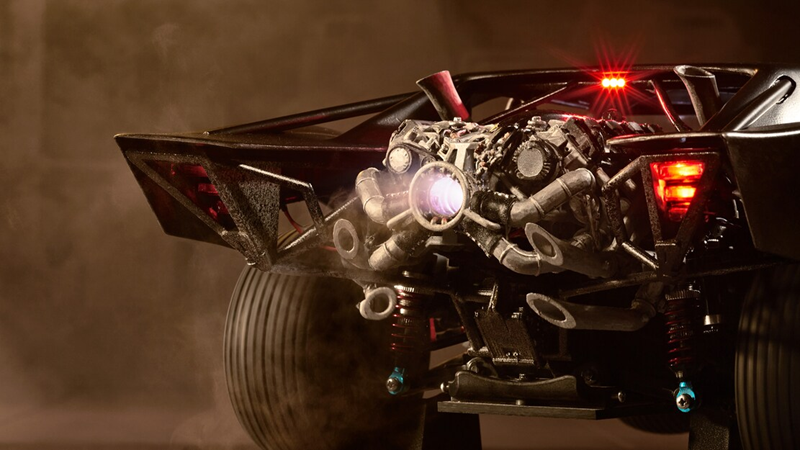 如果您对乐高的蝙蝠侠战车不太满意的话,不如看看这台价格是它5倍还多的风火轮版蝙蝠侠战车。这台比例为1:10的遥控板蝙蝠侠战车细节比乐高的要真实太多了,它有着逼真的悬架系统、LED车灯以及车尾排气管内极为真实的喷火效果。