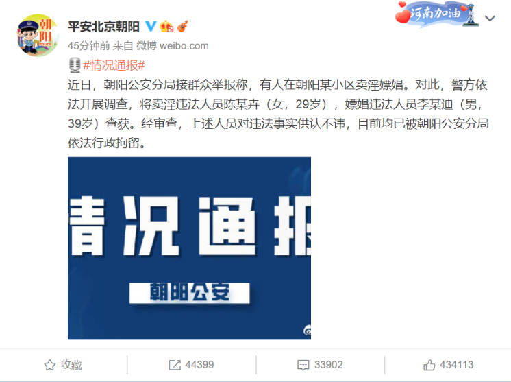 快讯:10月21日晚上,北京朝阳区警方发出一则通告:朝阳公安分局接群众举报称,有人在朝阳某小区卖淫嫖娼。对此,警方依法开展调查,将卖淫违法人员陈某卉(女,29岁),嫖娼违法人员李某迪(男,39岁)查获。经审查,上述人员对违法事实供认不讳,目前均已被朝阳公安分局依法行政拘留。