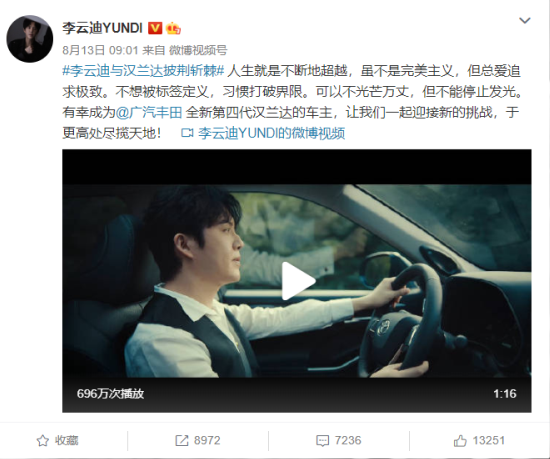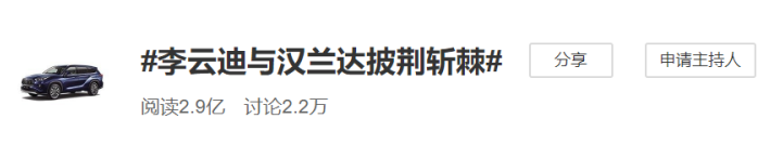 而就在不久前,广汽丰田全新 汉兰达还聘请了李云迪为合作伙伴。在微博中,“李云迪与汉兰达披荆斩棘”的话题毅然还有2.9亿的阅读量及2.2万次网友讨论。