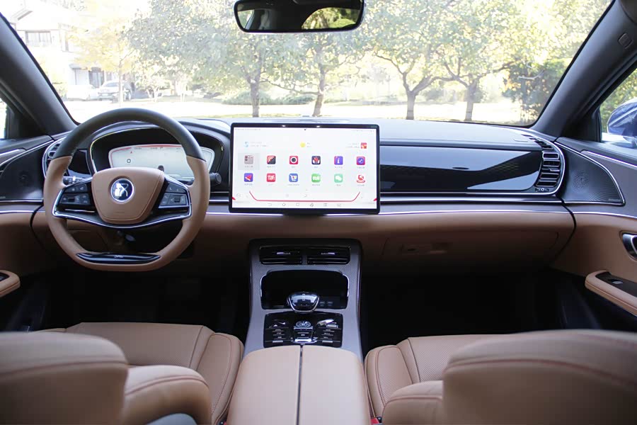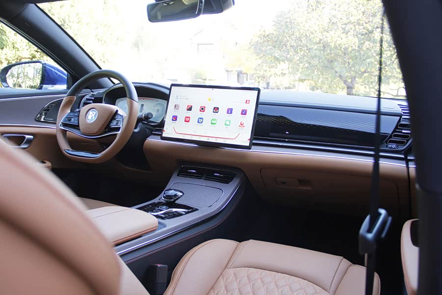 本次体验的车型是汉EV四驱高性能版旗舰型,并且外观使用了极光蓝配色,内饰使用了金鳞橙凝夜紫配色,实车可以说是汉EV最高版本车型。