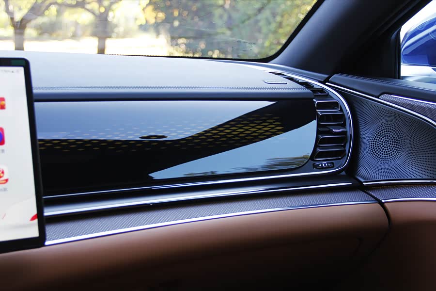 内饰部分的配色变化主要是两个方面,其一、金鳞橙。从实拍图能看到座舱内大面积的橙色真皮材料的包覆,视觉感觉很高级。官方表示金鳞橙灵感来自于波光、代表着温暖与能量,以及对未来的美好希望,坐在车内感受这橙色高级内饰,触摸着真皮打孔的座椅,确实会让人感觉到舒适与满足。