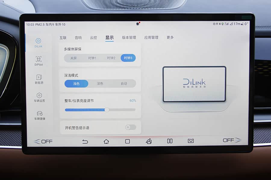 其次,DiLink 4.0智能网联系统5G版,它在车机UI设计上新增了一种背景风格,官方设置为深浅模式,老款车型上只有深色模式,新增浅色模式显示风格更简洁,并且深浅模式可根据白天夜晚自动选择,更能满足不同的使用场景需求。