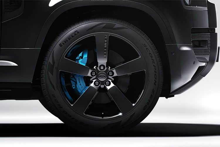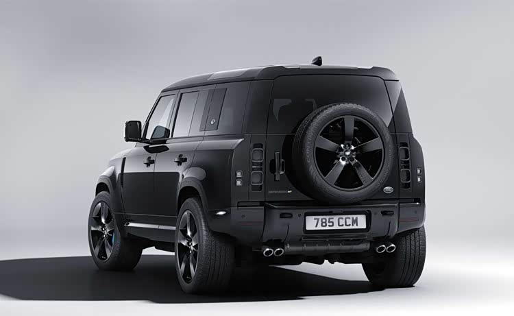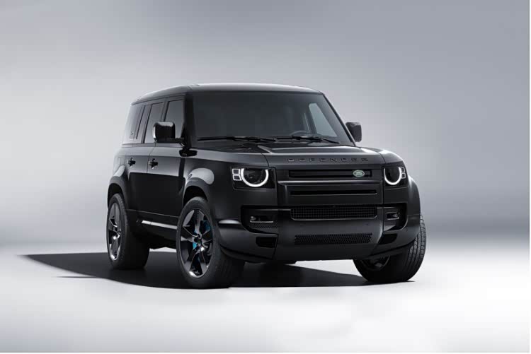 路虎卫士007典藏版基于全新路虎卫士110 V8车型打造,外观搭载扩展黑色套件,包含22寸亮黑效果合金轮毂、标志性的暗影蓝前制动卡钳以及专属“Defender 007”尾部徽章。