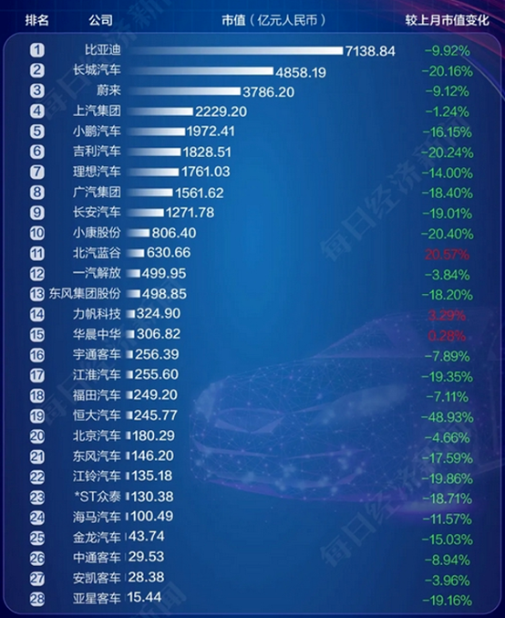 比亚迪、长城和蔚来依然稳坐前三,与8月的市值排名相同。但市值都出现了9%到20%的下降。
