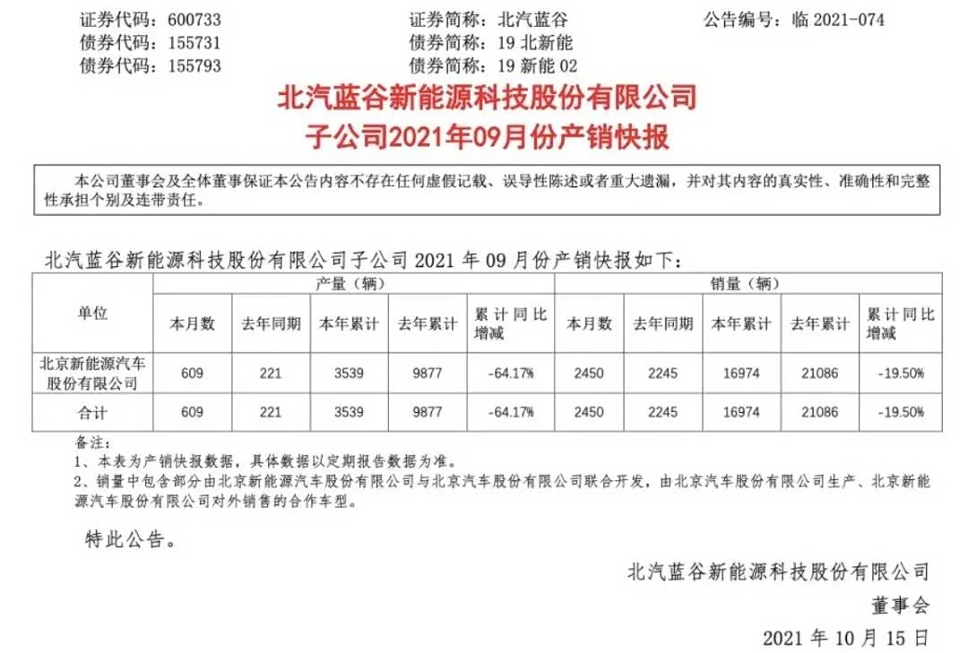 北汽蓝谷发布公告,子公司北京新能源汽车股份有限公司9月产量609辆,本年累计3539辆,同比下降64.17%;9月销量2450辆,本年累计销量16974辆,同比下降19.5%。