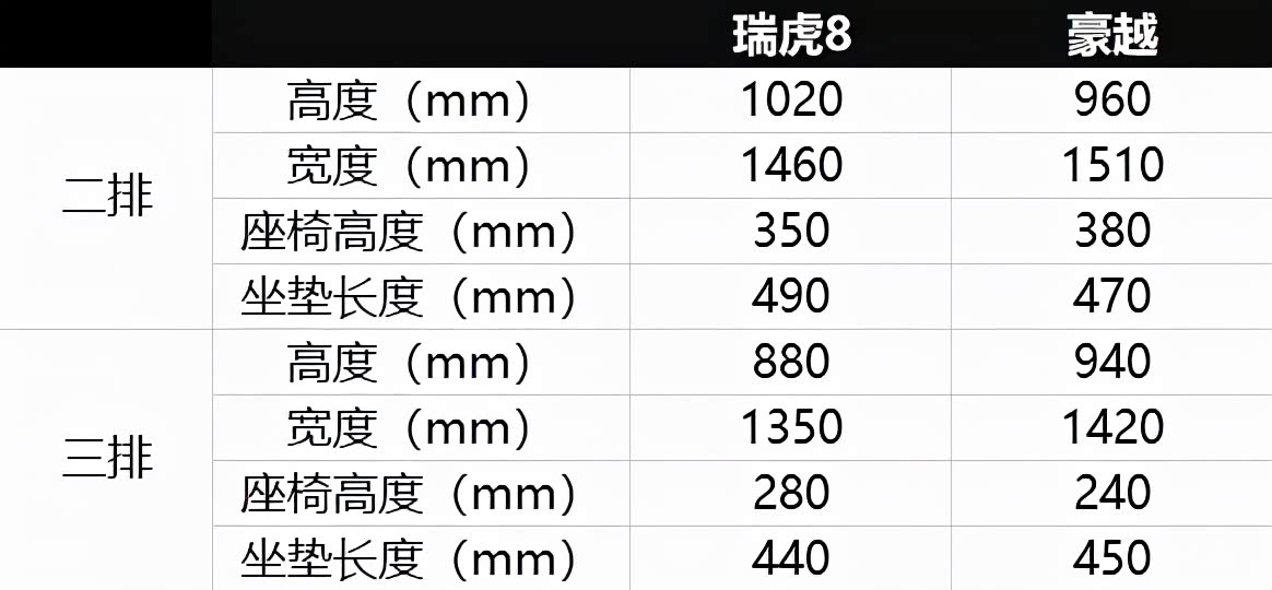 豪越的车内宽度会比较占优,其第二排的车内宽度能有1510mm,第三排也有1420mm,相较之下,瑞虎8第二排的宽度只有1460mm,第三排只有1350mm。六七十毫米,大概就是四根手指的宽度,能宽松不小了。