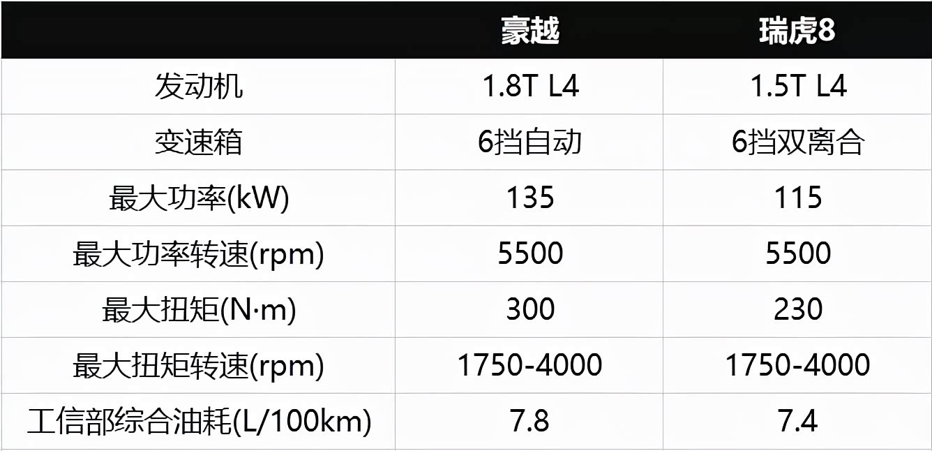 不可否认,虽然豪越在车身尺寸上比瑞虎8高半级,但在动力上却明显低半级。