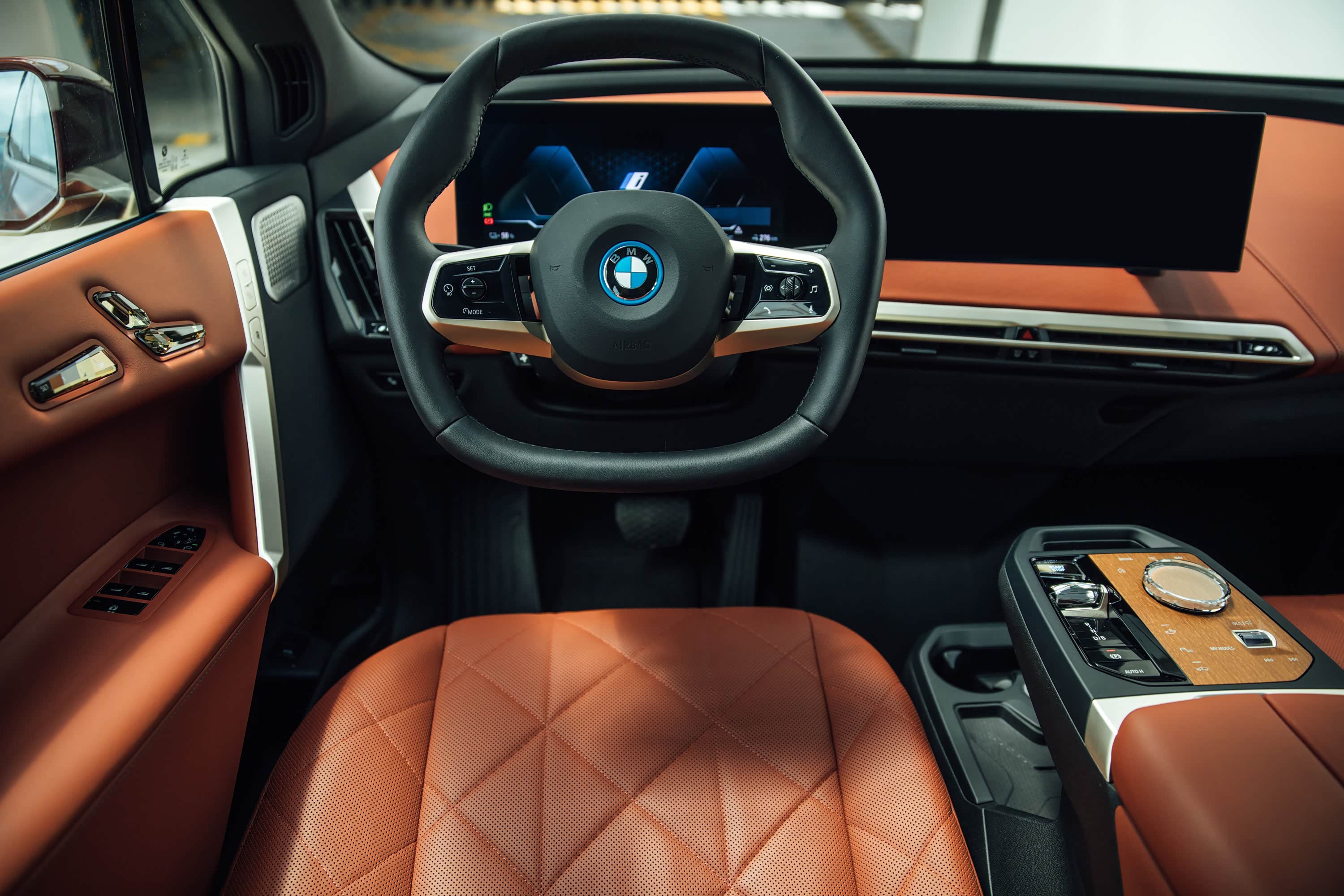 BMW iX是BMW首款采用六边形方向盘的车,上下都是平坦的设计,非常方便驾驶员观察仪表。方向盘上的多功能按键也进行了很大程度的简化,因此出现了滚轮按键,按键带有震动回馈,按键不管是按动还是滚动操作,阻尼感都很舒服。