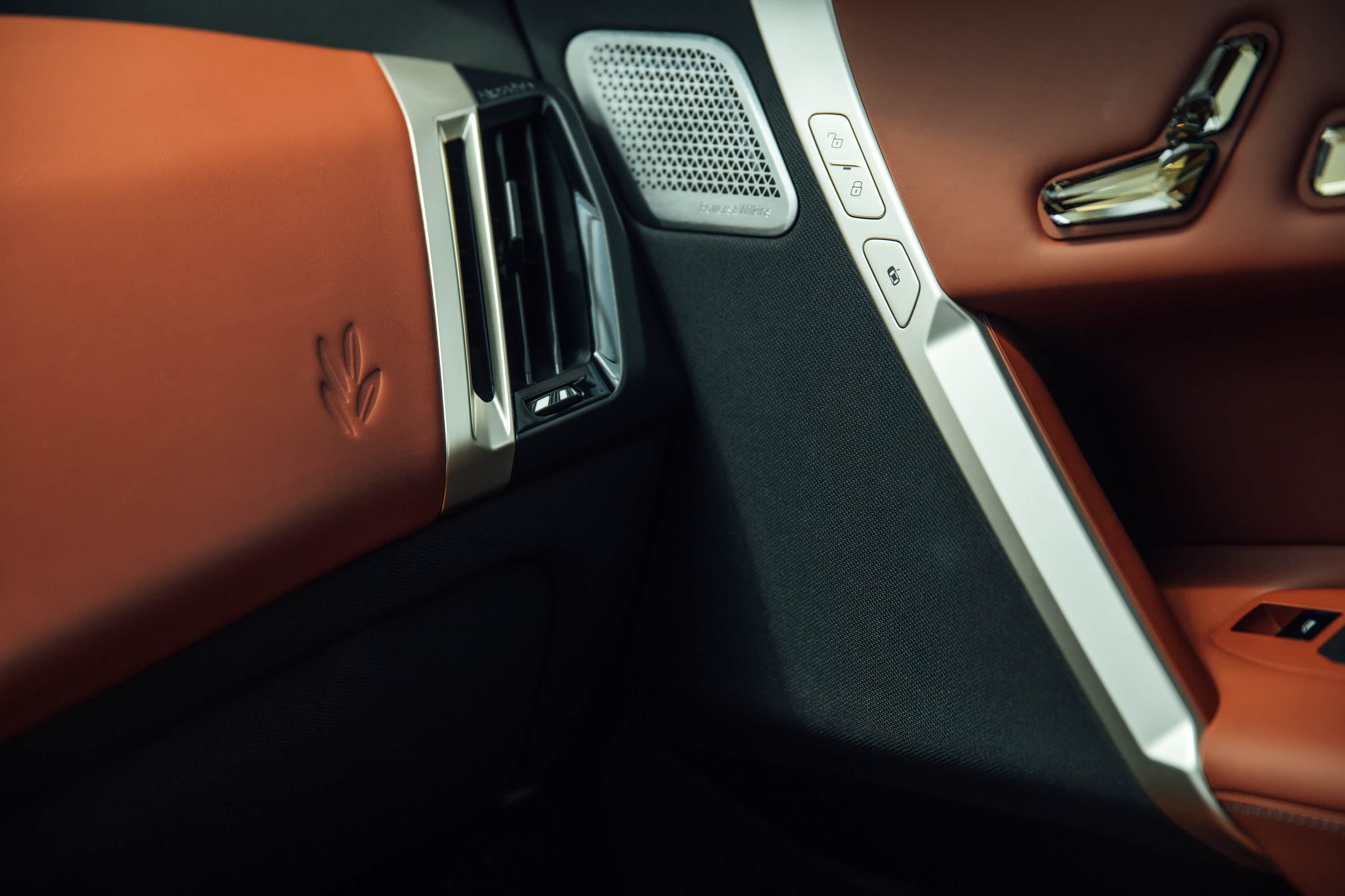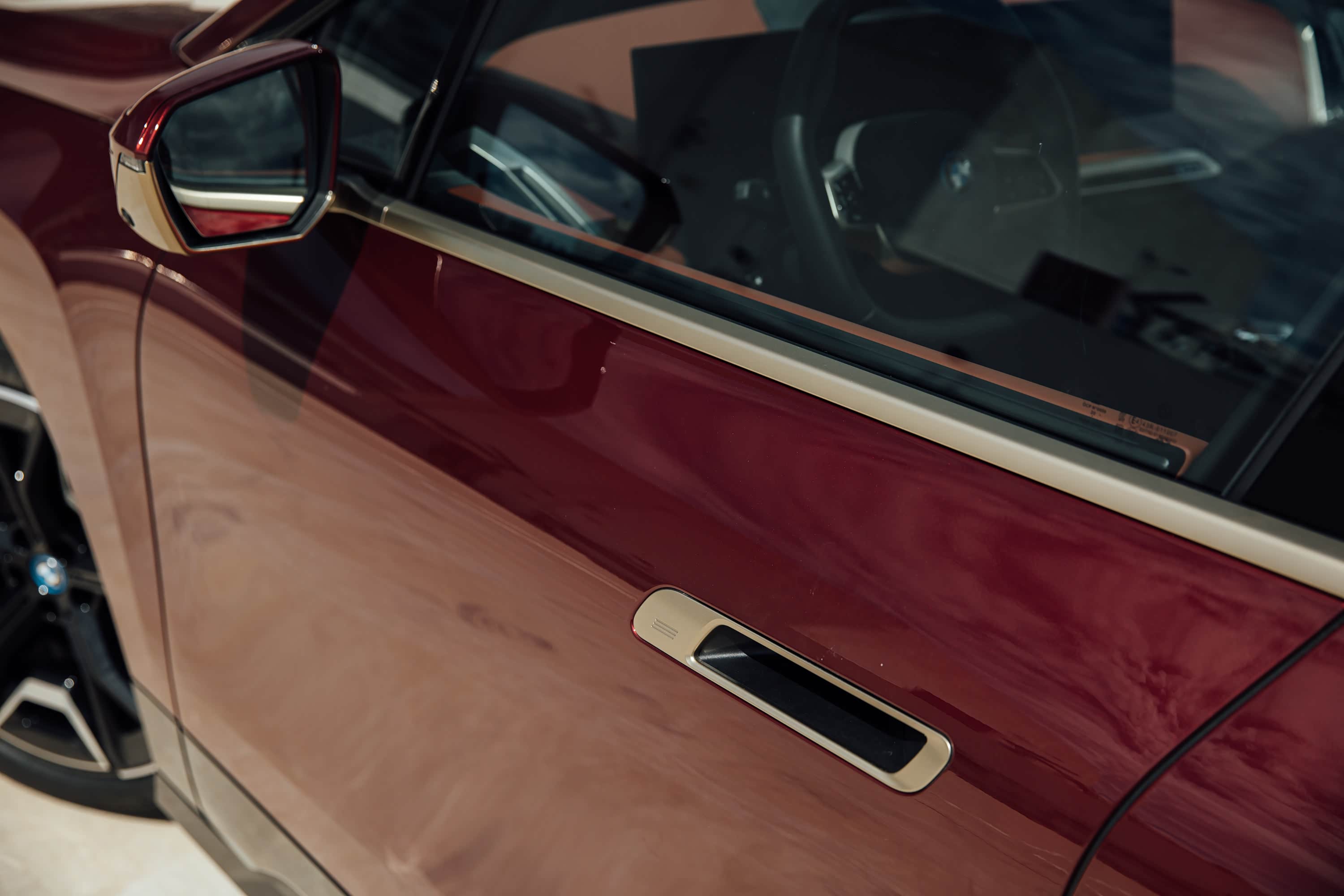BMW iX门把手采用的是内藏式电子开关,打开车门,可以看到无框式车门设计,这在BMW SAV车型里算是第一个。