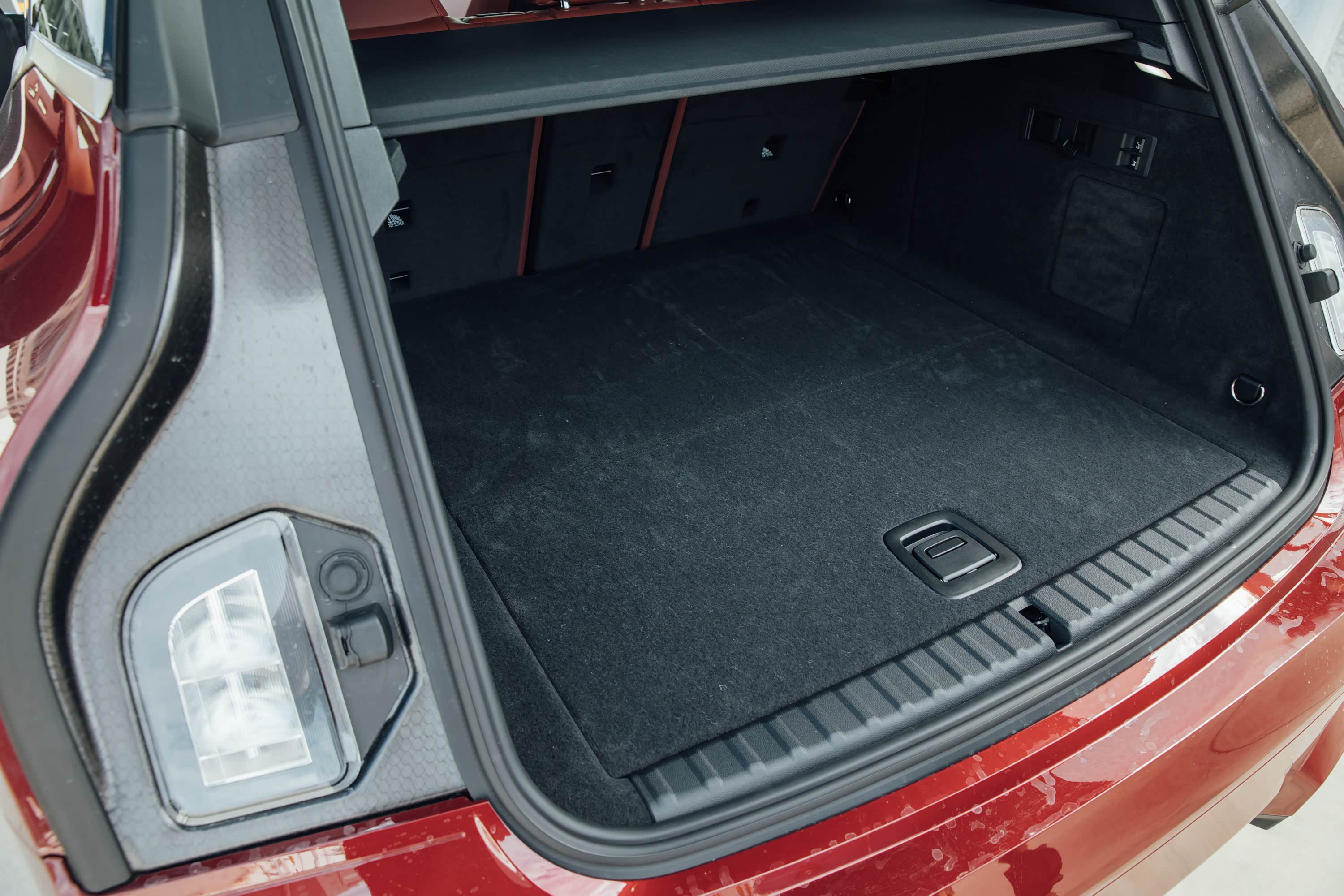 后备箱尾门框架采用了碳纤维材质,在框架上提供有示宽灯,这是为了打开尾门的情况下也可以警示后方车辆。后备箱开口方正,内部规整,第二排座椅支持4:2:4比例放倒,放倒后可以形成纯平的后备箱空间,后备箱的整体实用性表现完全可以媲美BMW X5。