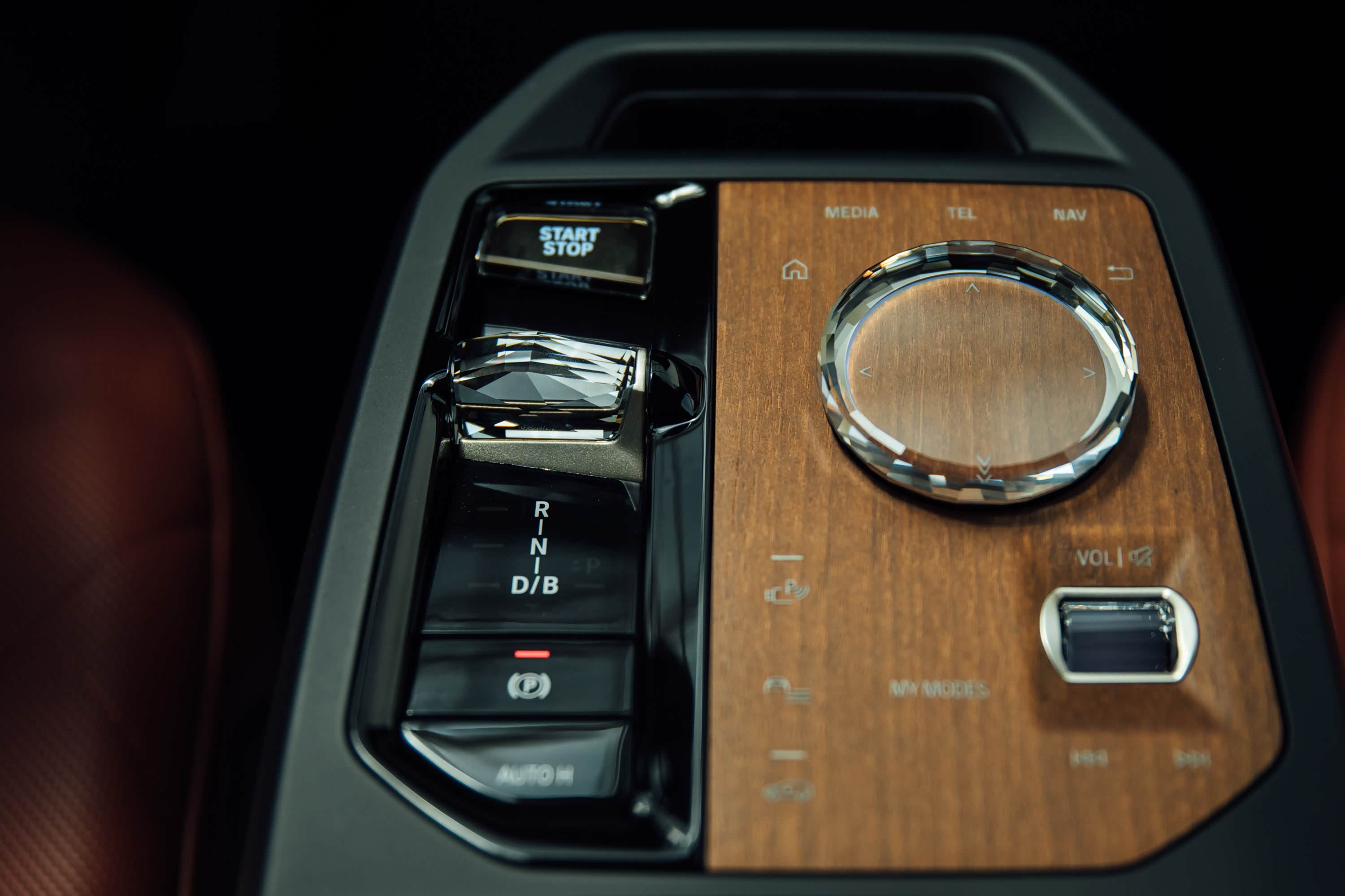 iDrive控制面板集成在了中央通道的悬浮式地台上。很有突破性的点在于,整车的关键控制按键都采用了水晶材质,座椅位置的调节按键、换挡按键、还有iDrive旋钮,都是晶莹剔透的水晶材质,搭配上木纹面板,高级感倍增。
