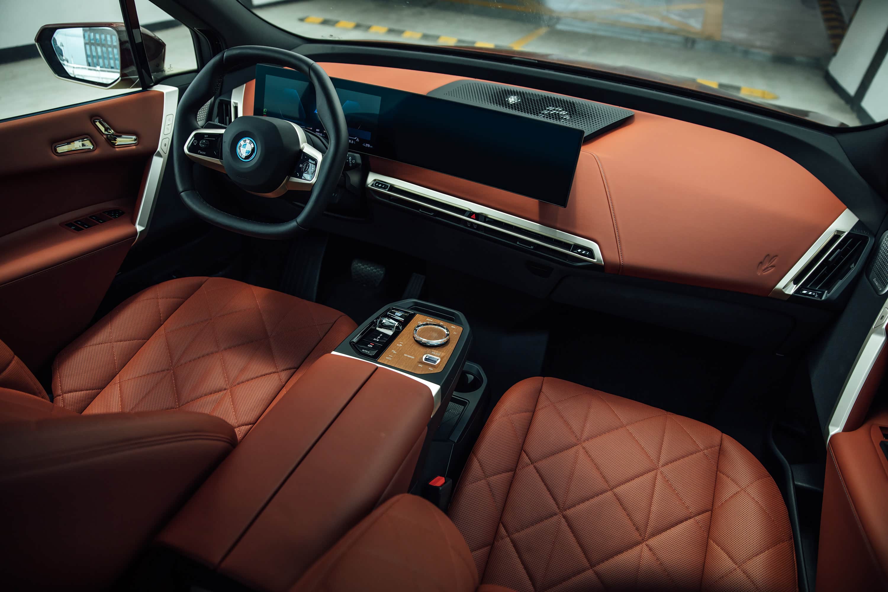 当然,这和BMW i系列一贯强调环保理念分不开关系。 其中车内大面积覆盖的皮质材料实际是由橄榄叶萃取物鞣制,环保的同时,触感柔软亲肤。其余部分也融入了织物,并没有一味地堆砌真皮,让内饰很有居家的温馨感。上车后闻不到任何气味,“真皮的味道才是豪华”的观念在BMW iX上已经落伍了。