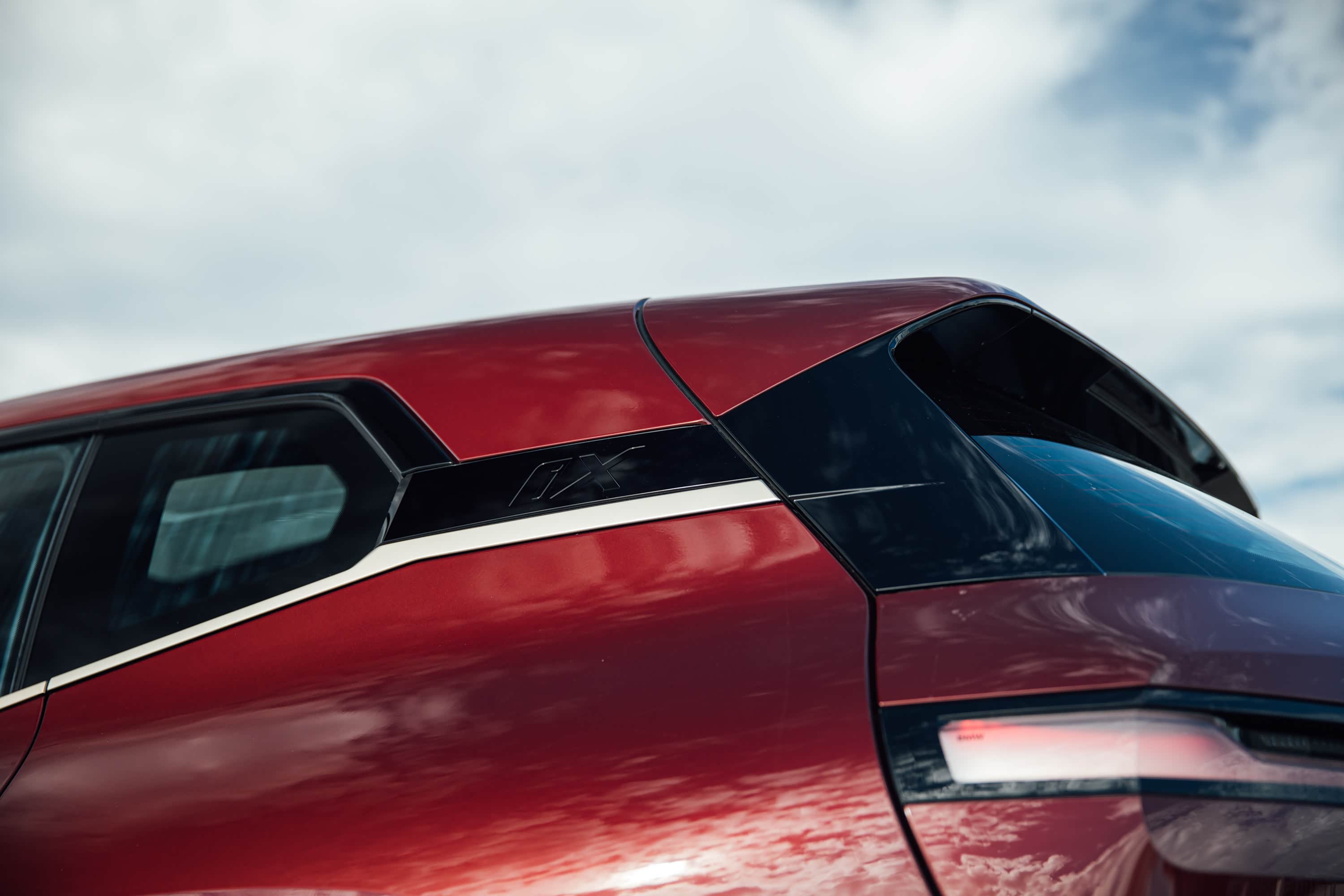 和大部分电动车一样,因为电池布置在车底,所以车侧显得非常的厚重,不过C柱上的悬浮式车顶设计,可以进一步优化我们在视觉上的厚重感。轮圈进行了空气动力学优化,并且尺寸达到了22英寸,搭配上代表着BMW电动蓝色的卡钳,视觉效果一流。