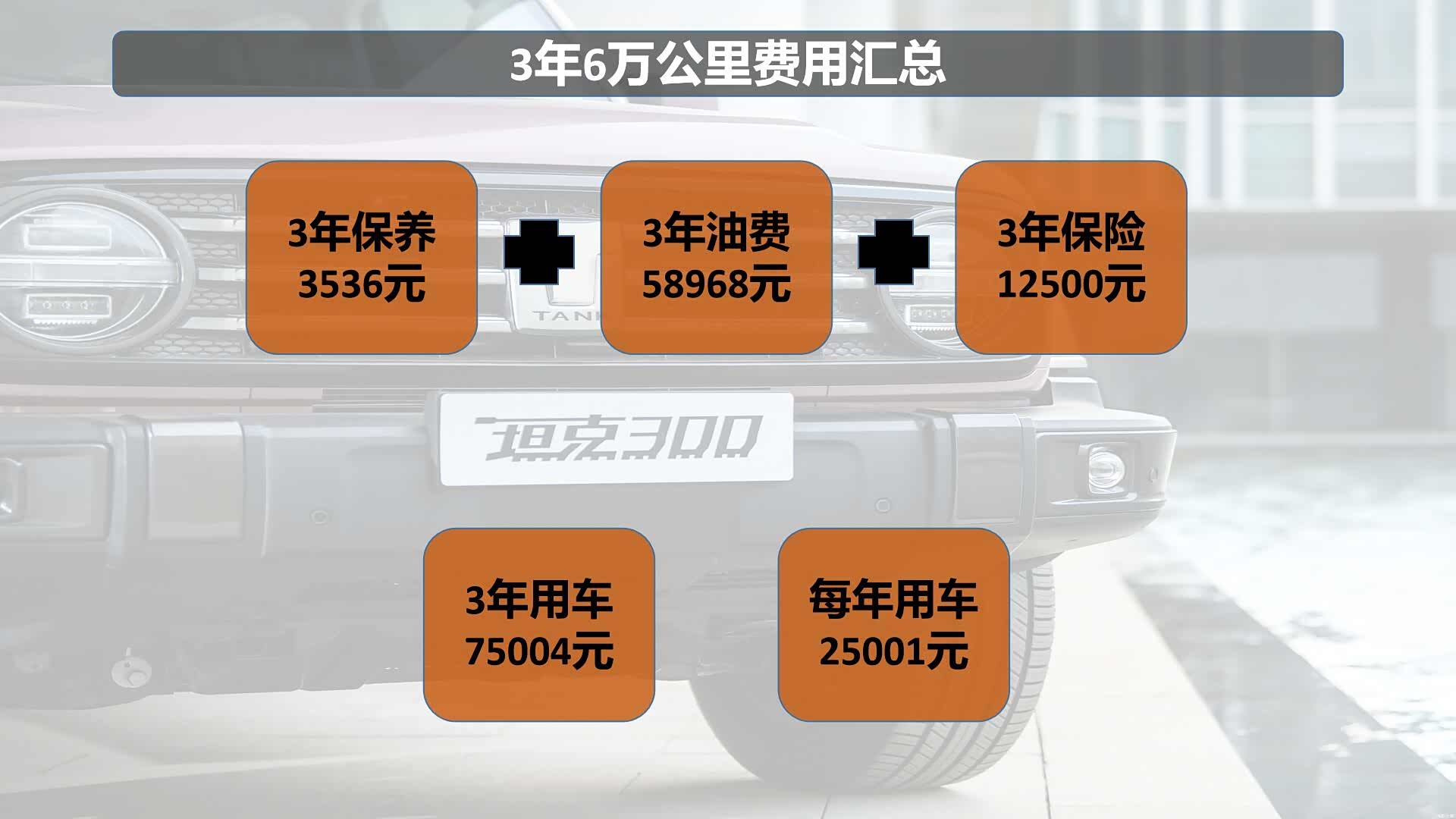 我们按照每年行驶2万公里,3年共行驶6万公里来计算一下坦克300的养车、用车成本如何?