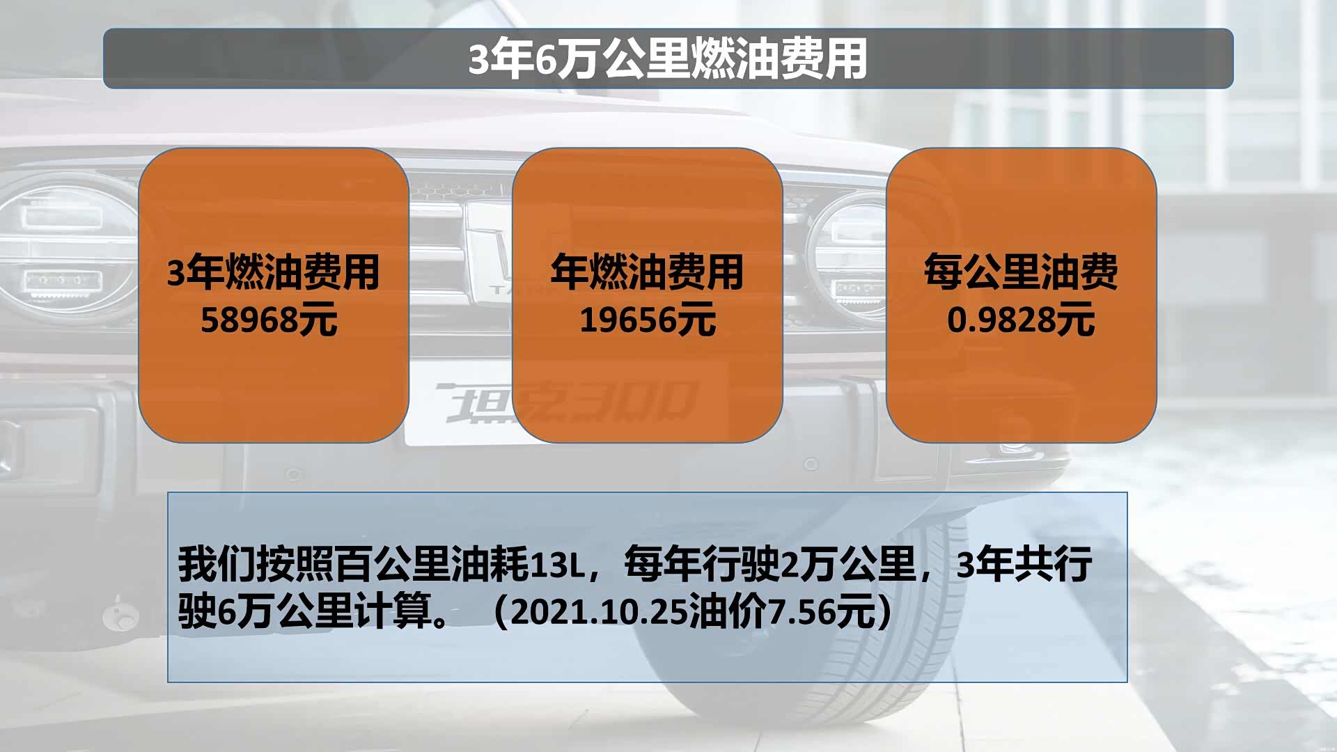 从厂家公布的NEDC循环模式下的综合油耗来看,坦克300两驱版车型的百公里油耗为9.3L,四驱版则为9.7L,从网友提供的数据来看,这款车型的百公里平均油耗在13L左右的水平。我们以百公里13L计算,92号汽油的价格在7.56元的水平(2021.10.25),6万公里共需要消耗燃油7800L,总共花费58968元,每年需要19656元,燃油费用不可谓不低。