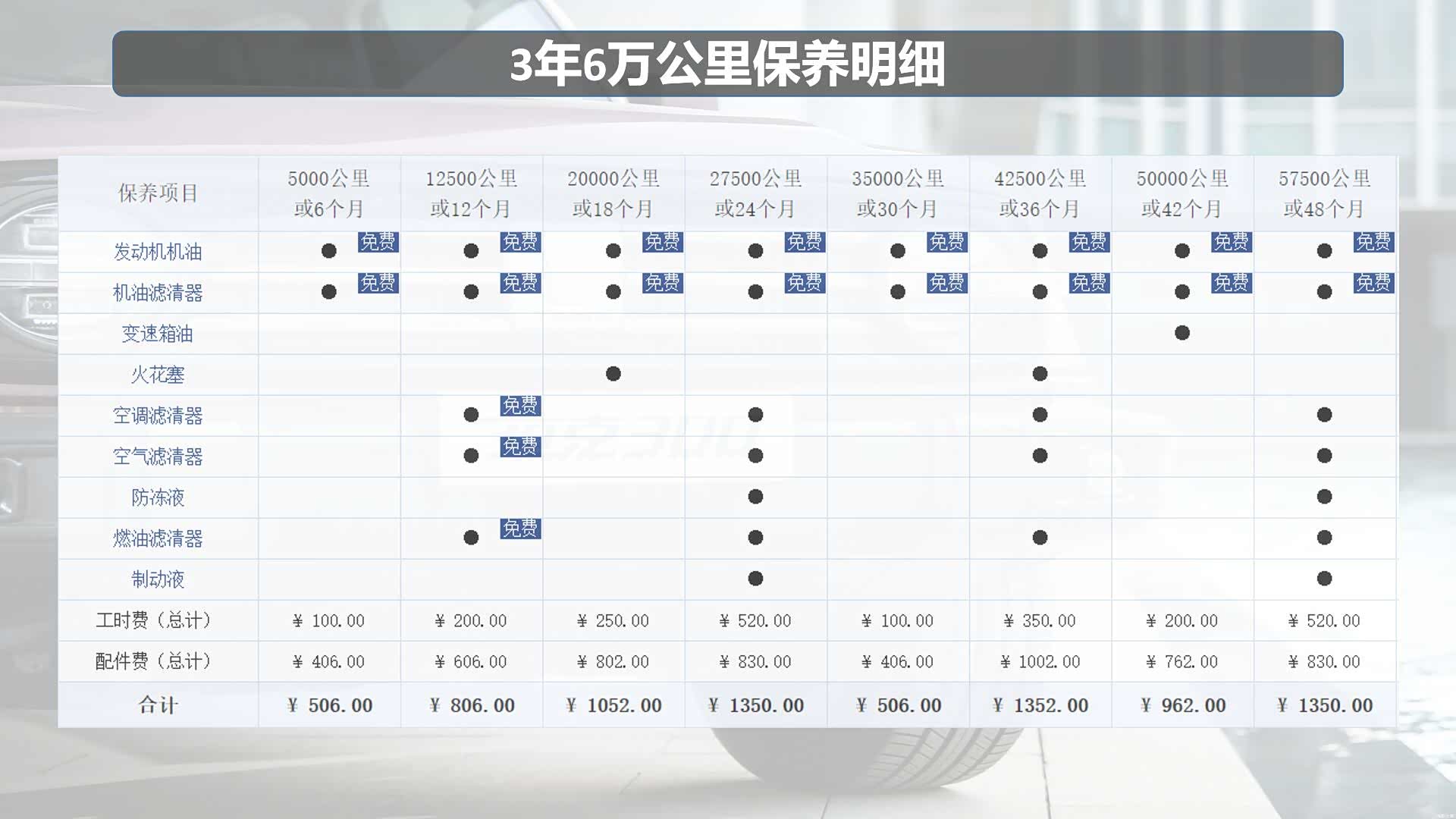 我们可以看到坦克300除了第一次保养为5000公里以外,其余每次保养的周期均为每7500km或者6个月。而我们如果按6万公里计算的话,这3年期间一共需要总共保养8次。其中机油、机滤是每次都要更换的,空气滤芯、汽油滤芯、空调滤芯则是每两次保养更换一次。由于前两次保养是全部免费,后面的8次保养免机油机滤以及工时费,所以前三年坦克300花费在保养上的费用一共是3536元。