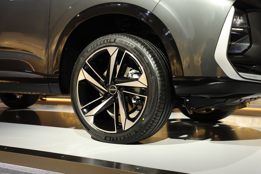 车身轮廓并没有大的变化,其长宽高分别为4676/1875/1725mm,轴距为2760mm。车侧的变化主要集中在轮圈、车门把手等细节之处。双五辐轮圈采用双色涂装,造型类似刀锋状,视觉效果很是出色。轮胎方面,实拍车型配备的是主打静音舒适的米其林浩悦PRIMACY 4系列轮胎,规格为235/45 R19。隐藏式门把手是时下比较流行的设计元素,算是与时俱进。