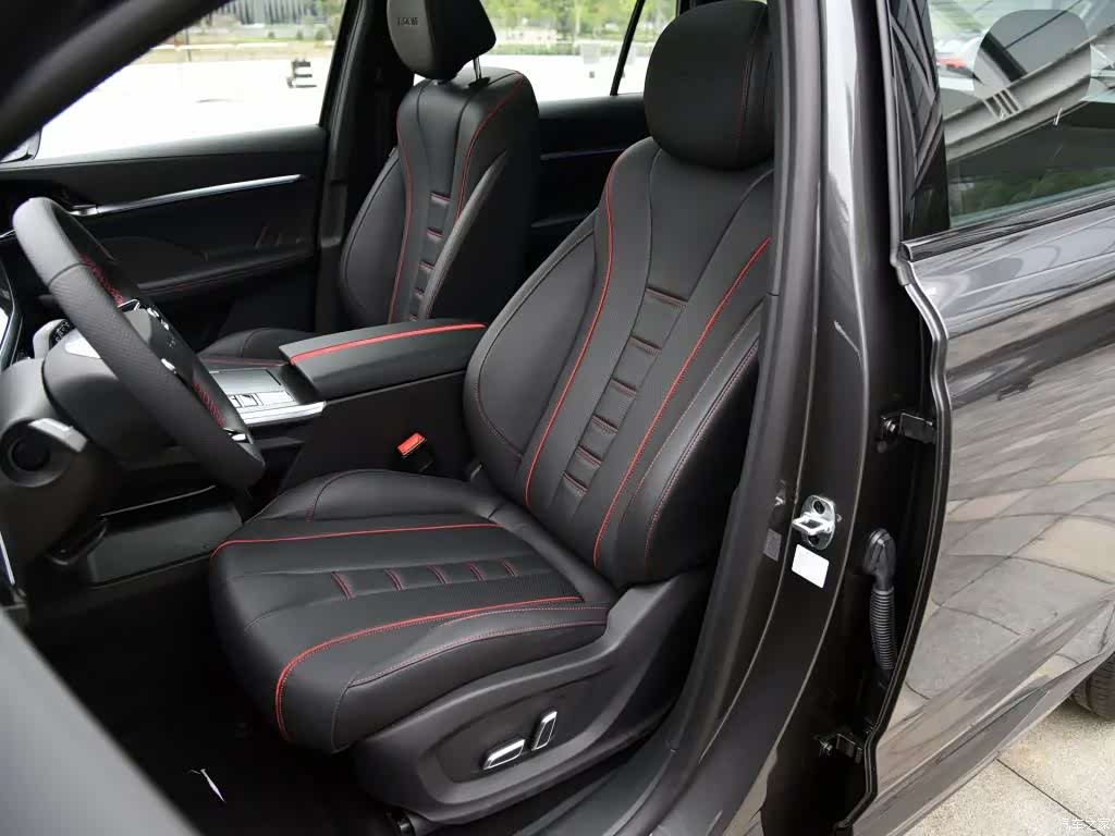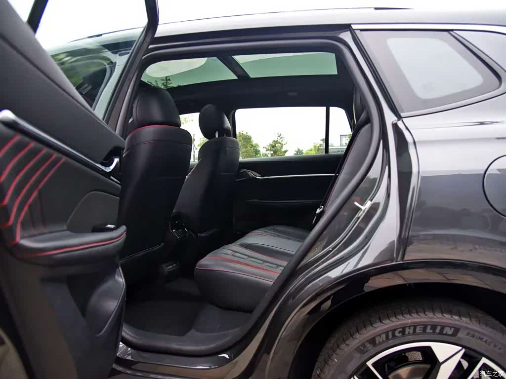座椅面料使用大量红色缝线点缀,并带有类似表链状的图案,档次感表现更好。配置方面,前排座椅支持电动调节以及座椅加热功能。后排的空间表现在同级别中有着一定的优势,腿部空间足够充裕,地板中央的凸起范围相对较小。全景天窗的尺寸足够大,乘客坐在后排不会产生压抑感。