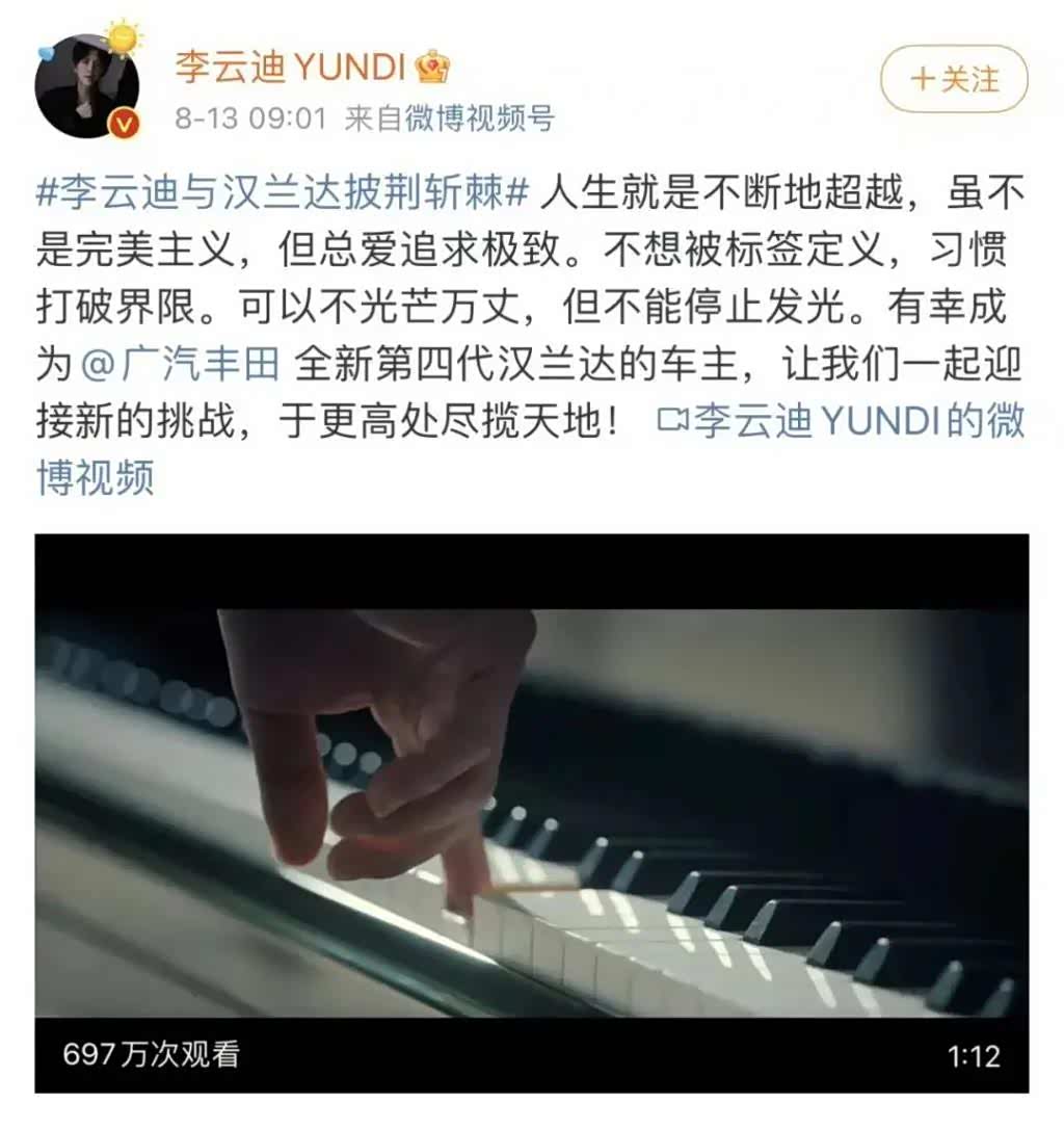 在汽车圈儿,曾经与李云迪合作过的汽车品牌不在少数。长城WEY、东风日产、广汽丰田等。最近的就是今年8月,李云迪以全新第四代汉兰达车主的身份,为该款新车造势。