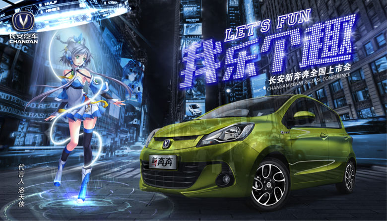 早在2014年,虚拟歌手Vsinger洛天依就成为了长安汽车“新奔奔”的形象代言人。新车发布会首次在国内上演了全息秀,成功地把虚拟歌手与大众文化相结合,将多元化的创意推向至更多更广的大众人群。