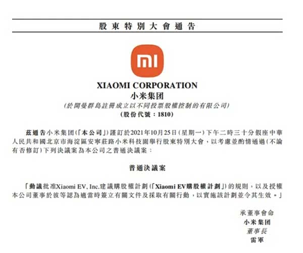 小米集团于昨日(10月25日)举行股东特别大会以批准采纳Xiaomi EV的股权激励计划,计划授权上限为10亿股,占Xiaomi EV已发行股份总数的10%。相关决议案获97.63%赞成比例,高票通过。