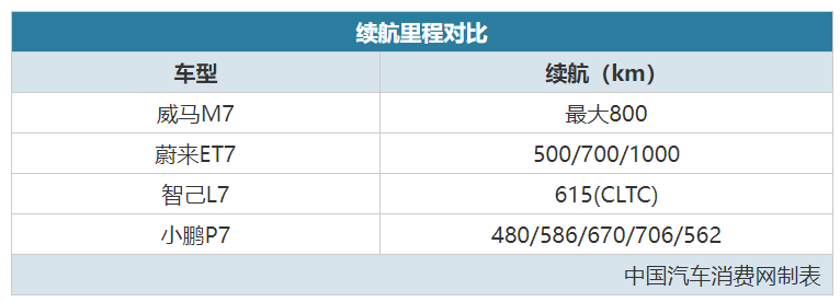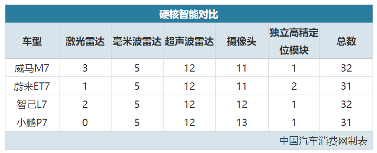 作为品牌首款轿车,威马M7与蔚来ET7、智己L7和小鹏P7无疑会被拉在一起比较。在硬件方面,四款车型的总配备差不多,多数都装配了激光雷达(小鹏P7没有,小鹏P5有),但威马M7在数量上更胜一筹。凭借3颗激光雷达&1000+TOPS算力,官方称M7达到2022年量产车顶级水准的说法并不算夸张。