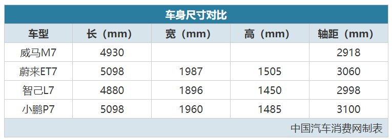 车身尺寸方面,威马M7目前只公布了4930mm的车长和2918mm的轴距。这个尺寸在同级中够看,但并没有特别突出。