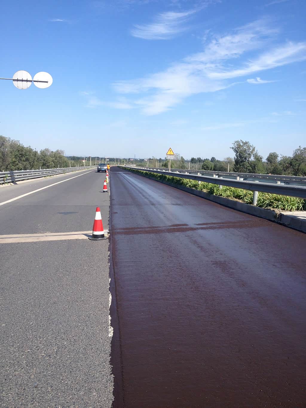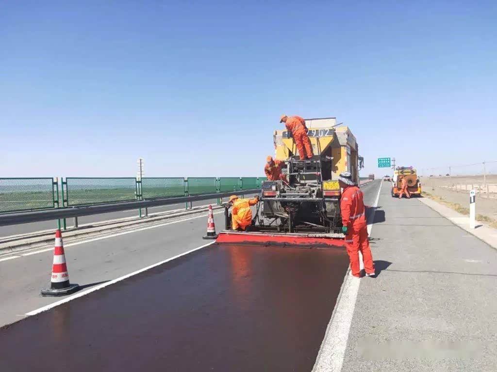 所以当路面出现各种问题时高速公路管理部门就要进行修复了,要说最好的方法当然是把旧路面挖开,重新铺沥青石子。这相当于修了一条新路,效果是最好的。但是成本也最高,而且维修时间更长,会影响道路通行和安全。所以现在都流行用专用的材料在路面上薄薄地摊铺一层,起到保养、维护或者修复的作用。这种处理方法可以封堵路面裂缝,可以填充不平整,还可以提高路面粗糙度从而增加车轮的抓地力。这些路面修复完后一般会呈现出一种偏红的颜色。
