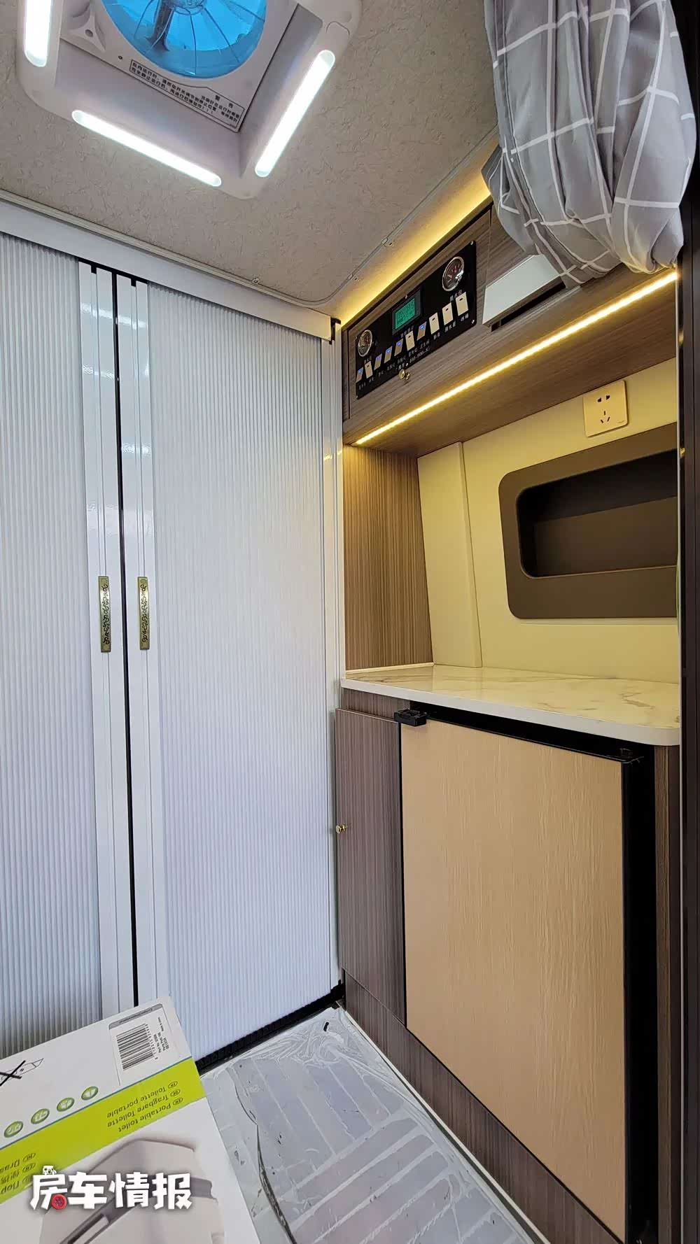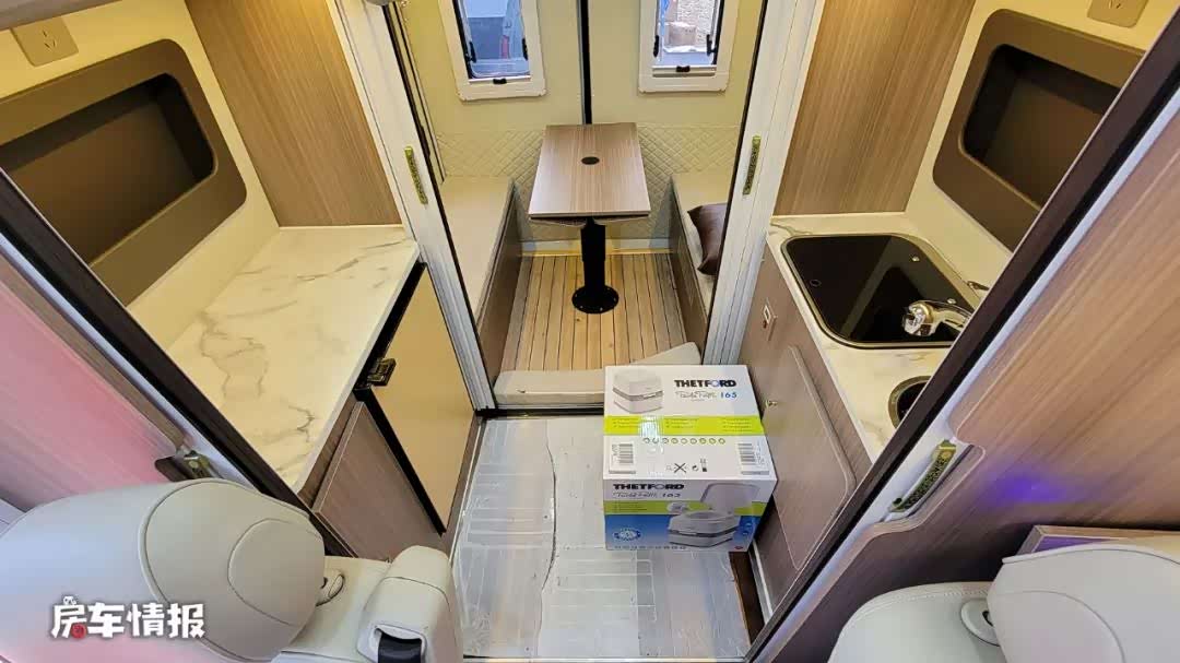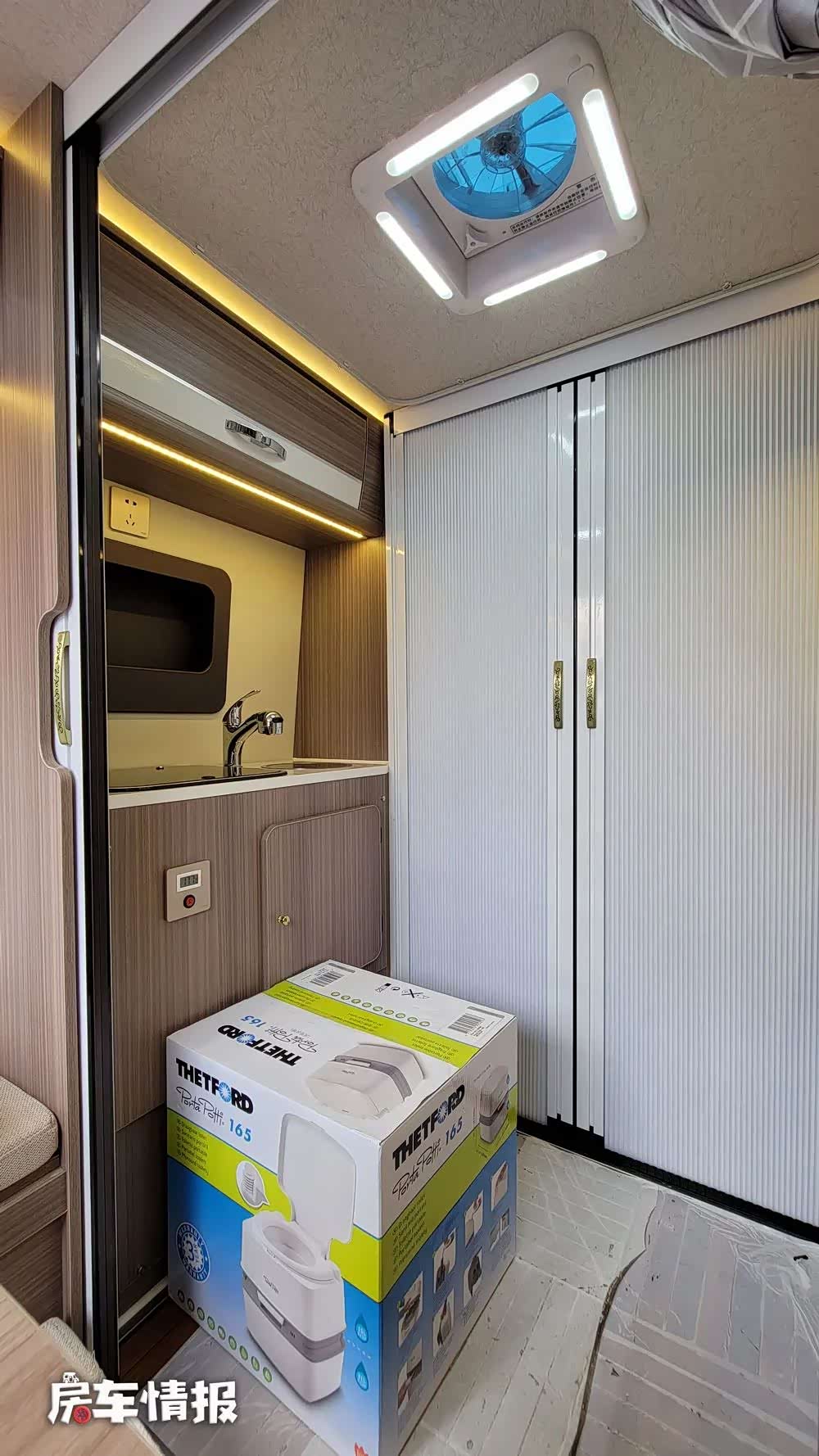 另一侧则是一个空置的桌面,下方嵌入了一台单开门冰箱,而顶部则是全车的水电控制区域,同时侧面墙壁上还带有220V的外接电源口,也可以按需外接其他家用小电器,满足日常更多的需求。另外全车还配置了一台便携式马桶,将前方的第二道门与后方的第三道门拉起来,也可以变成一个临时的卫生间,解决基础的生活需求。