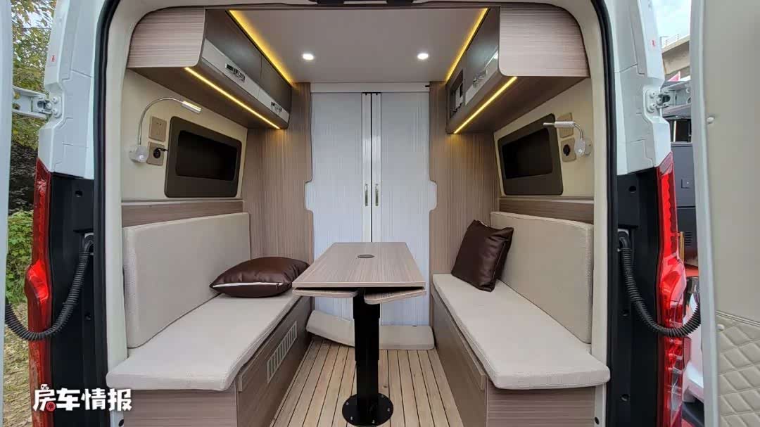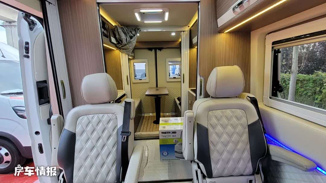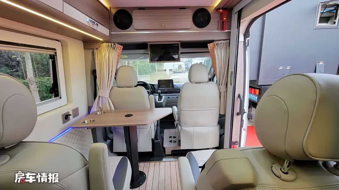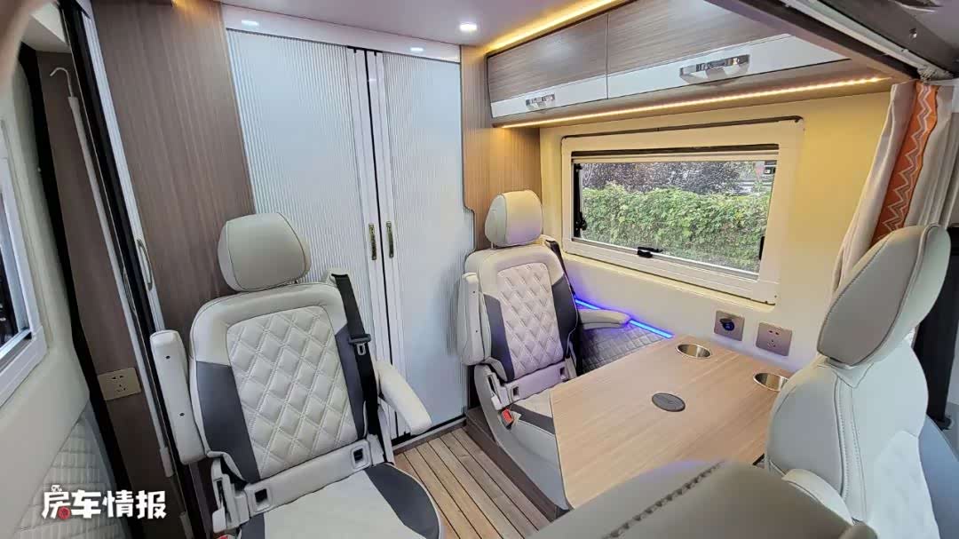 位于最前方的是两个乘客座椅+升降餐桌的设计,座椅都采用航空座椅的设计,可以提升整体乘坐的舒适度,同时配备了两条安全带,结合主副驾驶座椅,整车最多可以核载4个人。