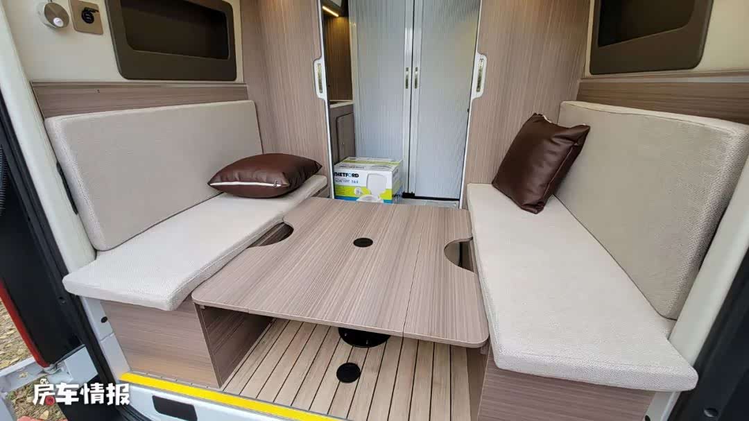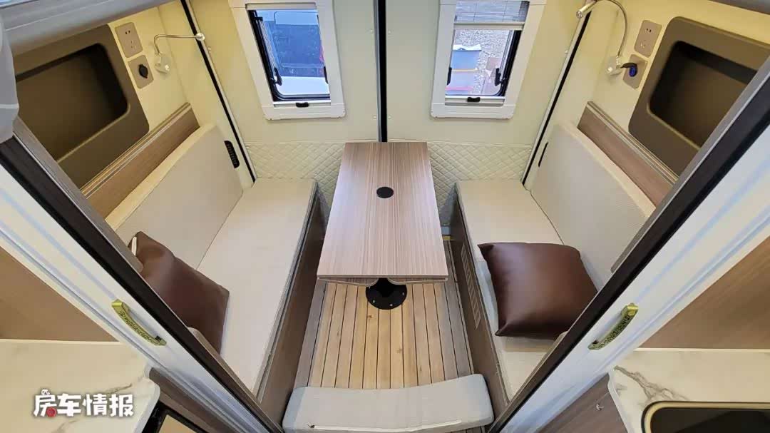 穿过第三大门就来到了这款房车的第二个会客区,采用了对坐式沙发+升降餐桌的设计,不过要注意的是因为没有配置安全带,所以行车时此会客区是不能坐人的。