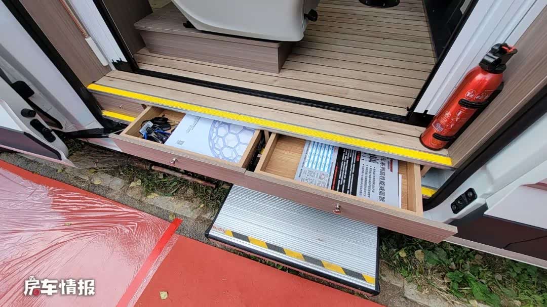进入第一道门,也就是我们常说的乘客门,乘客门处还设计两个小型的抽屉,可以放一些上车换的拖鞋,也方便使用,车厢内部的设计还是和我们常见的B型房车布局不太一样的,整体的氛围感和装修风格也让人感觉比较舒服。